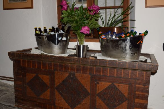 Sektempfang mit Häppchen beim Schloss anschließend Party bei uns.