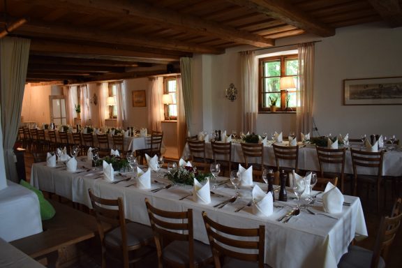 Begrüßen Sie Ihre Gäste bei einem gemütlich Empfang im Biergarten und feiern Sie anschließend in unserem Saal.