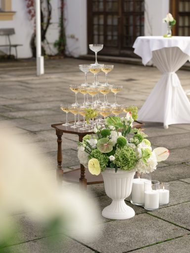 Sektempfang mit Häppchen beim Schloss anschließend Party bei uns.
